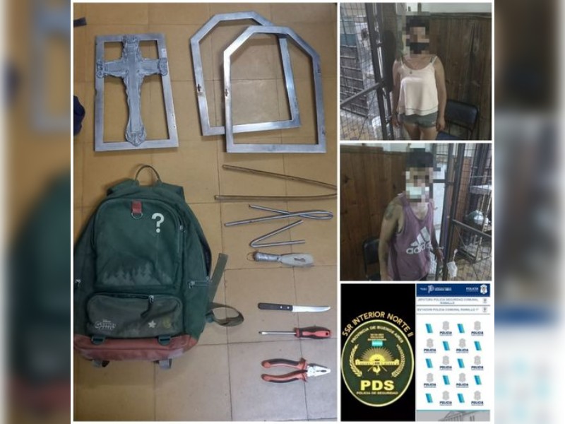 Este martes, siendo las 20:30 hs y tras un llamado al 911 que alerta sobre la presencia de dos personas sustrayendo elementos del cementerio local, personal de la Estación de Policía Comunal Ramallo Primera aprehende en Artigas y Velázquez a un masculino mayor de edad (29) y una femenina mayor de edad (32) con marcos de sepultura y decoraciones de metal de sepulturas antiguas en su poder.