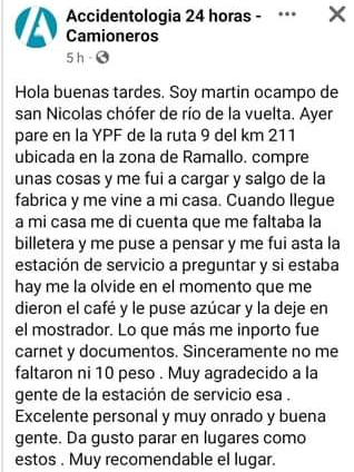 «Hola buenas tardes. Soy martin ocampo de san Nicolas chófer de río de la vuelta. Ayer pare en la YPF de la ruta 9 del km 211 ubicada en la zona de Ramallo. compre unas cosas y me fui a cargar y salgo de la fabrica y me vine a mi casa. Cuando llegue a mi casa me di cuenta que me faltaba la billetera y me puse a pensar y me fui asta la estación de servicio a preguntar y si estaba hay me la olvide en el momento que me dieron el café y le puse azúcar y la deje en el mostrador. Lo que más me inporto fue carnet y documentos. Sinceramente no me faltaron ni 10 peso . Muy agradecido a la gente de la estación de servicio esa . Excelente personal y muy onrado y buena gente. Da gusto parar en lugares como estos . Muy recomendable el lugar».