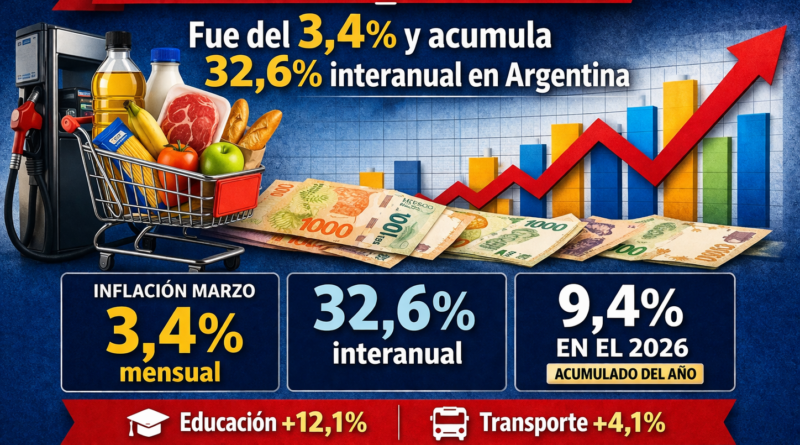 La inflación en Argentina registró en marzo de 2026 una suba del 3,4% mensual, según