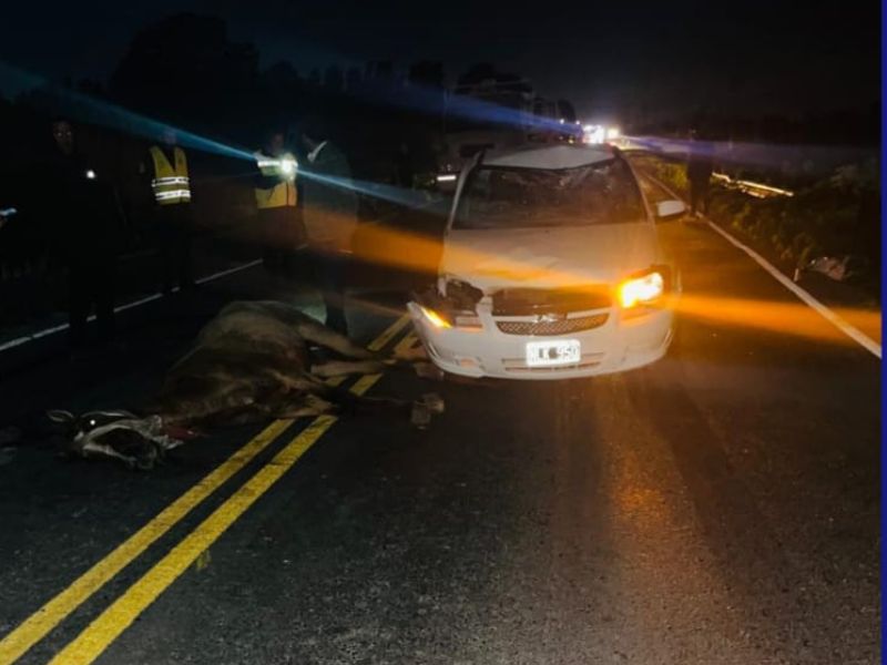 El conductor, un hombre de 33 años resultó con golpes en la mano y la acompañante, mujer de 51, con algunos de mayor consideración, pero que no revestirían gravedad. Ambos fueron trasladados al nosocomio local. El tránsito estaba cortado en ambos carriles a la espera del arribo de Policía Científica. El caballo quedó muerto sobre la cinta asfáltica.