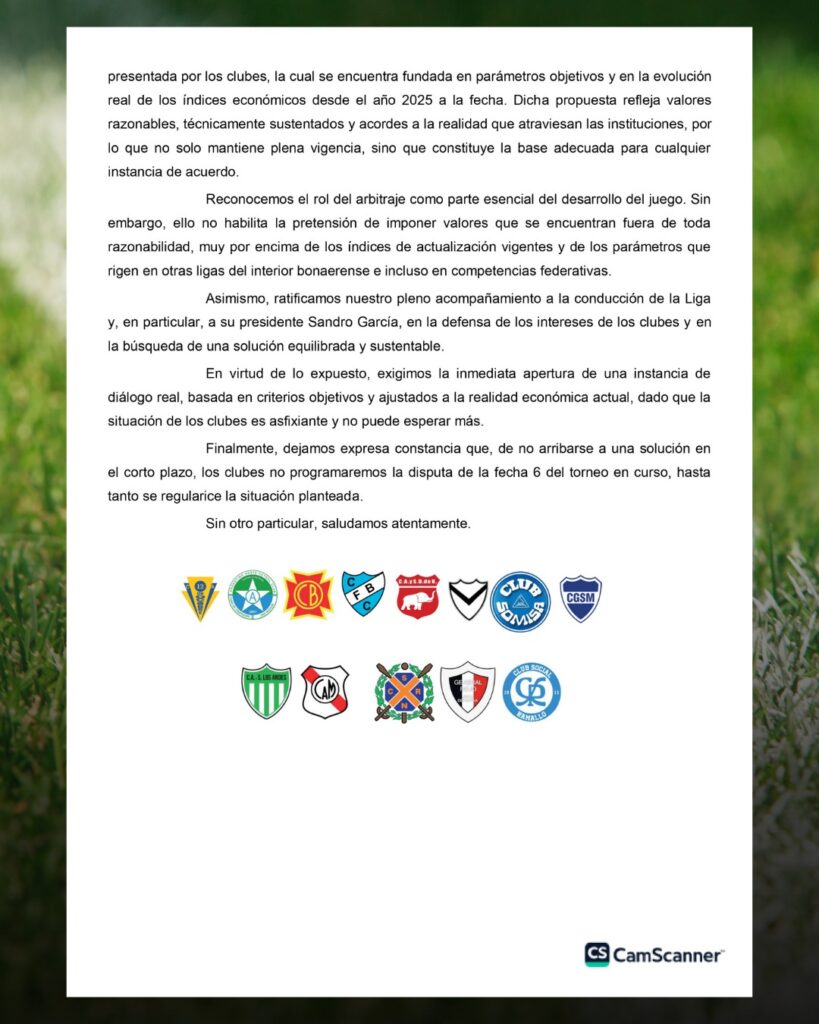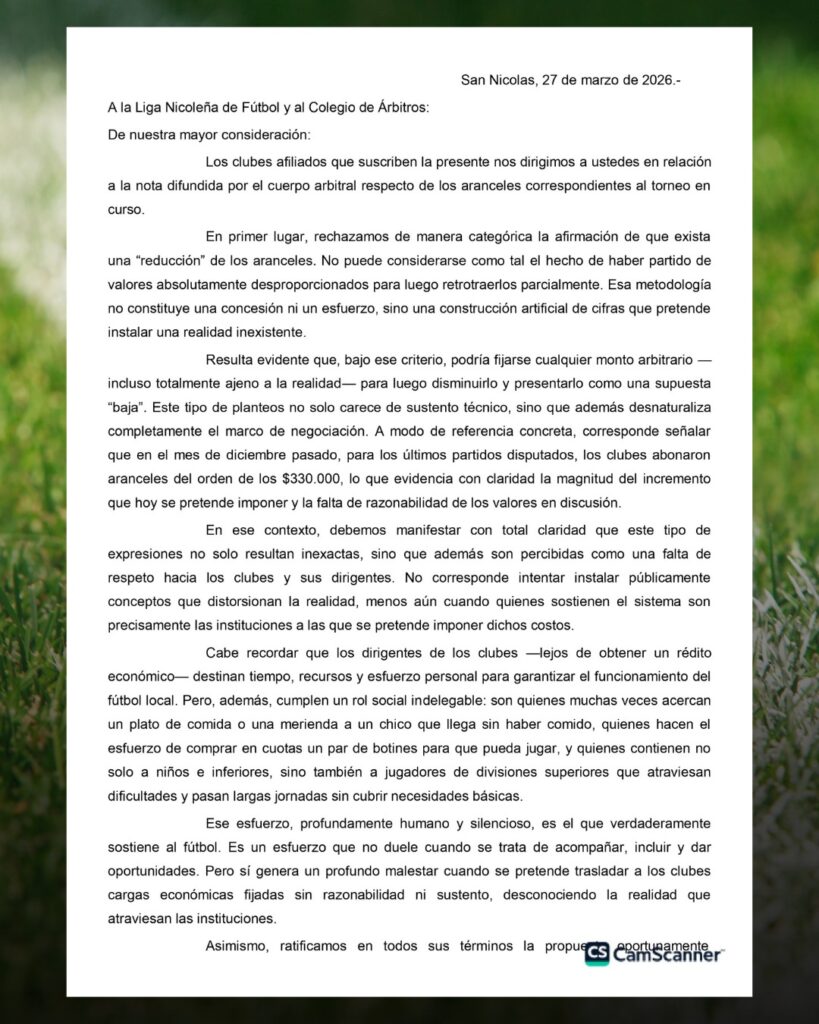 La difusión del documento generó repercusiones inmediatas, aunque desde la Liga Nicoleña negaron la existencia de un pedido formal presentado por las instituciones. Sin embargo, más allá de esa aclaración, el conflicto entre las partes es real.