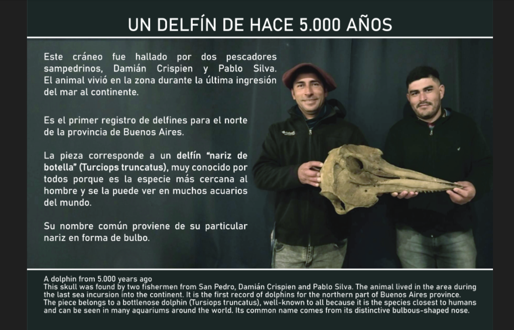 Desde la Dirección del Museo Paleontológico de San Pedro, José Luis Aguilar, explica detalles de este hallazgo histórico: “El primer contacto con el descubrimiento de los dos pescadores nos llegó de parte de Nicolás Crispien, operador de la radio local y primo de Damián, solicitando colaboración del museo para identificar `algo` que los dos amigos acababan de sacar del río. Cuando vi la imagen del cráneo no lo podía creer. Un cráneo de delfín no se saca todos los días del fondo del río!!”