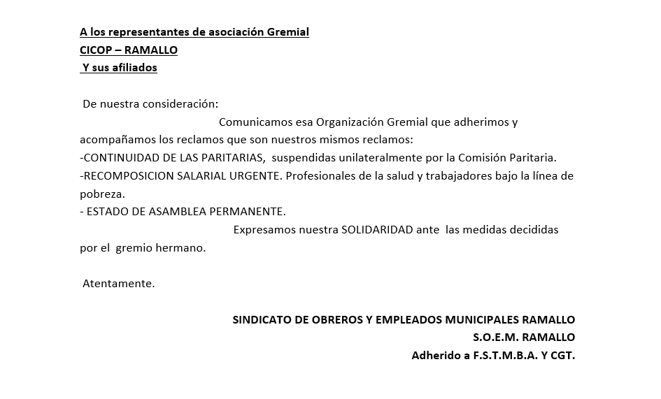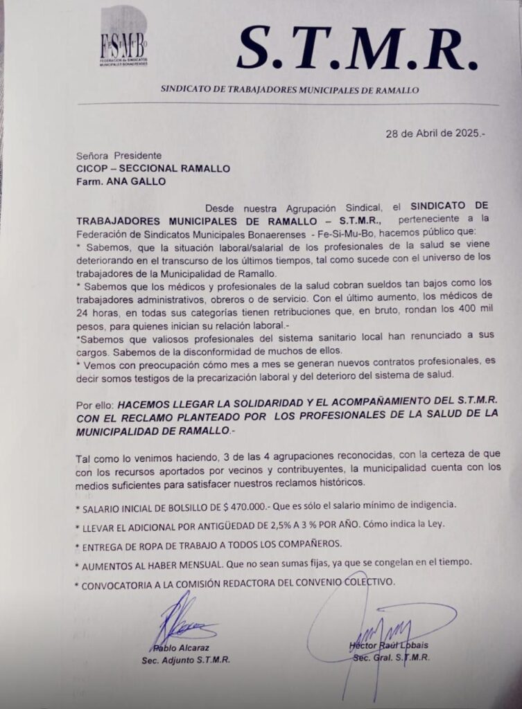 Los sindicatos STMR (Sindicato de Trabajadores Municipales de Ramallo) y SOEM (Sindicato de Obreros y Empleados Municipales) expresaron su acompañamiento y solidaridad con el gremio CICOP Ramallo, que esta semana llevará adelante medidas de fuerza en reclamo por la reapertura de las paritarias municipales y la mejora de los salarios de los trabajadores de la salud.