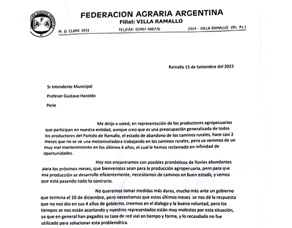 La nota de Federación Agraria Argentina – filial Ramallo, fue enviada el 15 de septiembre y todavía no fue respondida. Le advierten, además, que los pronósticos indican la probabilidad de lluvias abundantes para los próximos meses; algo bueno para la producción pero que exige un esfuerzo en la conservación de los caminos.