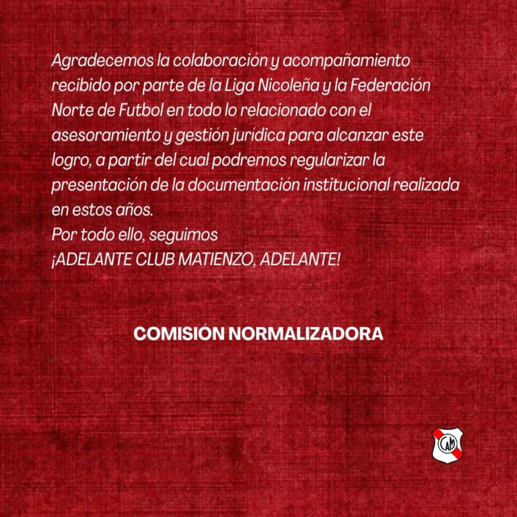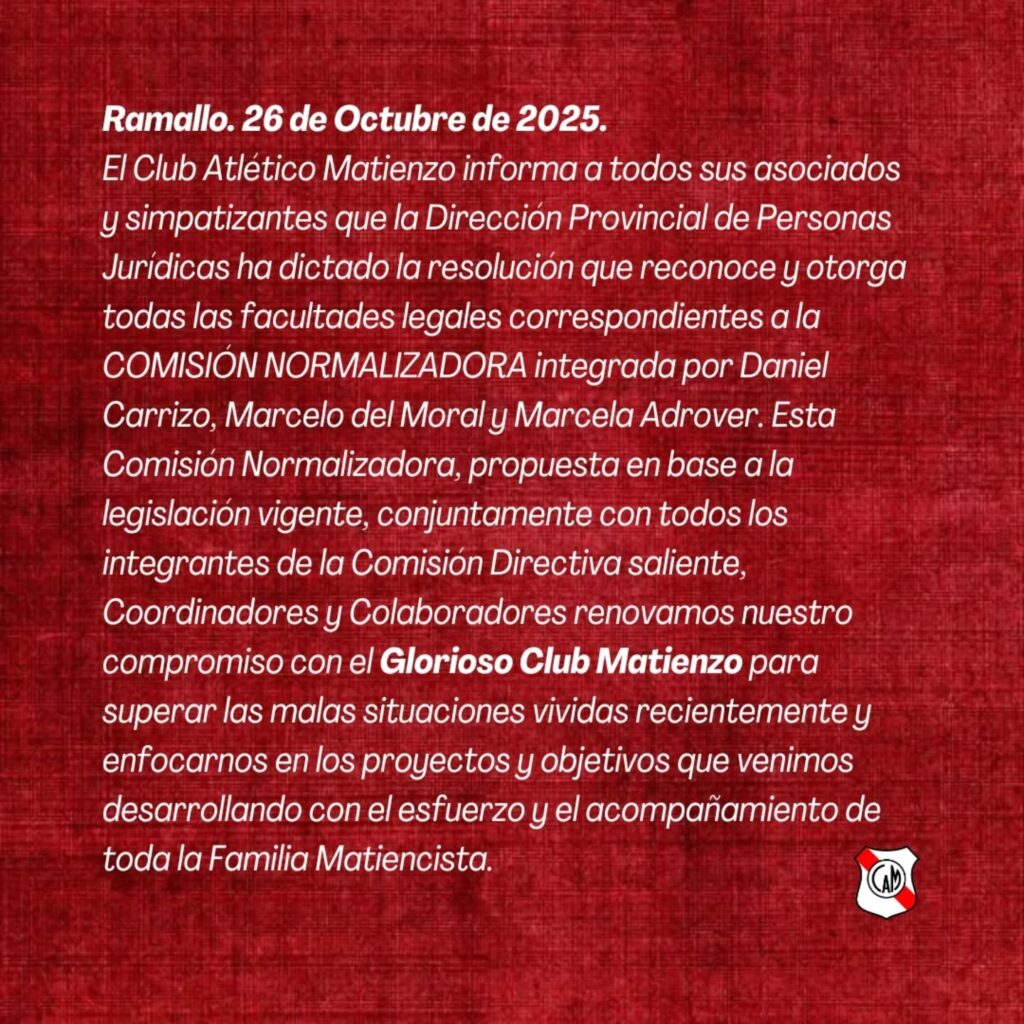 El Club Atlético Matienzo informó que la Dirección Provincial de Personas Jurídicas dictó una resolución mediante la cual reconoce y otorga todas las facultades legales correspondientes a la nueva Comisión Normalizadora de la entidad.