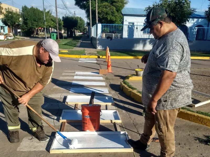 En el marco de los trabajos diarios de la cuadrilla municipal, la Secretaría de Obras y Servicios Públicos, realiza trabajos de pintado de sendas peatonales y ochavas en diferentes establecimientos educativos, con el objetivo de dar ordenamiento a los flujos vehiculares, y fundamentalmente brindar seguridad a los peatones.