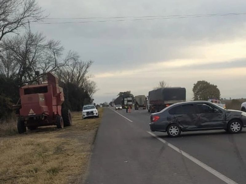 Fue en la tarde de este martes, aproximadamente en el Km. 16, sentido Ramallo – La Violeta. Por razones que se deberán establecer, se produjo una colisión entre una cosechadora Vasalli 1200, conducida por masculino de 56 años, con domicilio en Pérez Millan, y Renault Symbol, color gris, que era manejado por una mujer de 56 años oriunda de Ramallo. La conductora del auto fue trasladada al Hospital José M. Gomendio de Ramallo con lesiones de carácter leves. El maquinista resultó ileso.