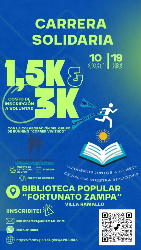 Además, la jornada será una verdadera fiesta cultural: habrá música, talleres en vivo, muestras artísticas, sorteos y servicio de cantina, con la idea de que las familias disfruten más allá de la carrera. “Queremos recuperar el espíritu de la biblioteca, que la comunidad vuelva a mirarla como un espacio vital de encuentro y lectura”, remarcó el entrenador.
